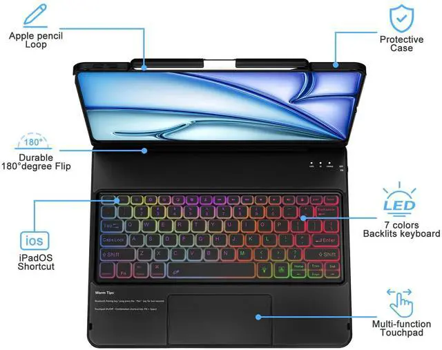 Durable Multifunctional Backlit KeyboardThe iPad Air 13 inch case keyboard brings an unparalleled typing experience, which can guarantee that typing is always with the hand and durable for a long time, The iPad Pro 12.9 case with Keyboard is equipped with hotkeys compatible with iPadOS to quickly adjust frequently used functions, at the same time, the keyboard provides special Backlit keys, allows an adjustable 7-color RGB LED backlight to shine through, even if it is
