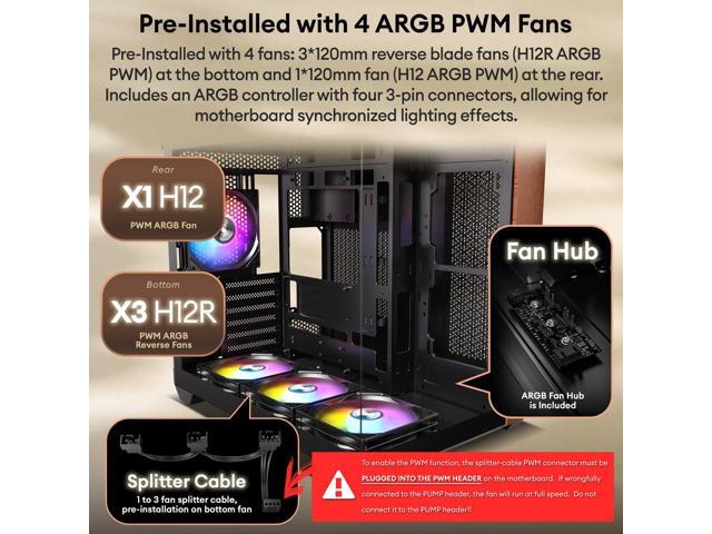 - Pre-Installed with 4 ARGB PWM Fans 3×120mm reverse blade fans (H12R ARGB PWM) at the bottom and 1×120mm fan (H12 ARGB PWM) at the rear. Included an ARGB controller with four 3-pin connectors, allowing for motherboard synchronized lighting effects.