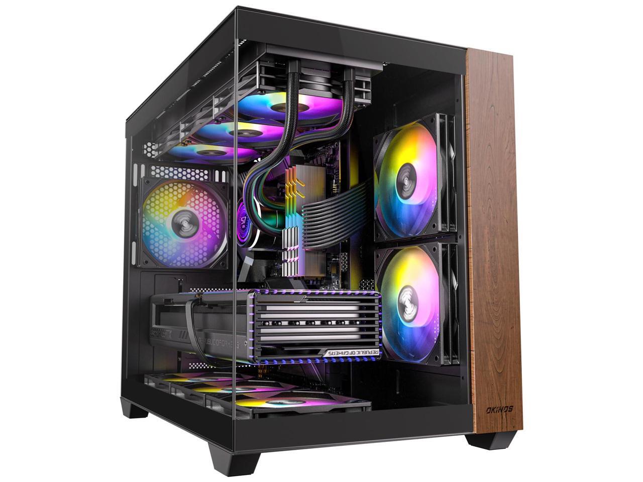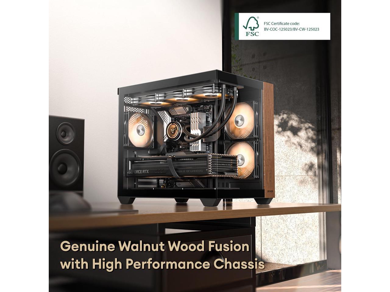Okinos Genuine Walnut Wood PC Case, Pre-Installed 4 x 120mm ARGB & PWM Fans, Type-C Port, Panoramic View Tempered Glass Side Panel, Black, ATX Case, Mid-Tower, Mirage 6