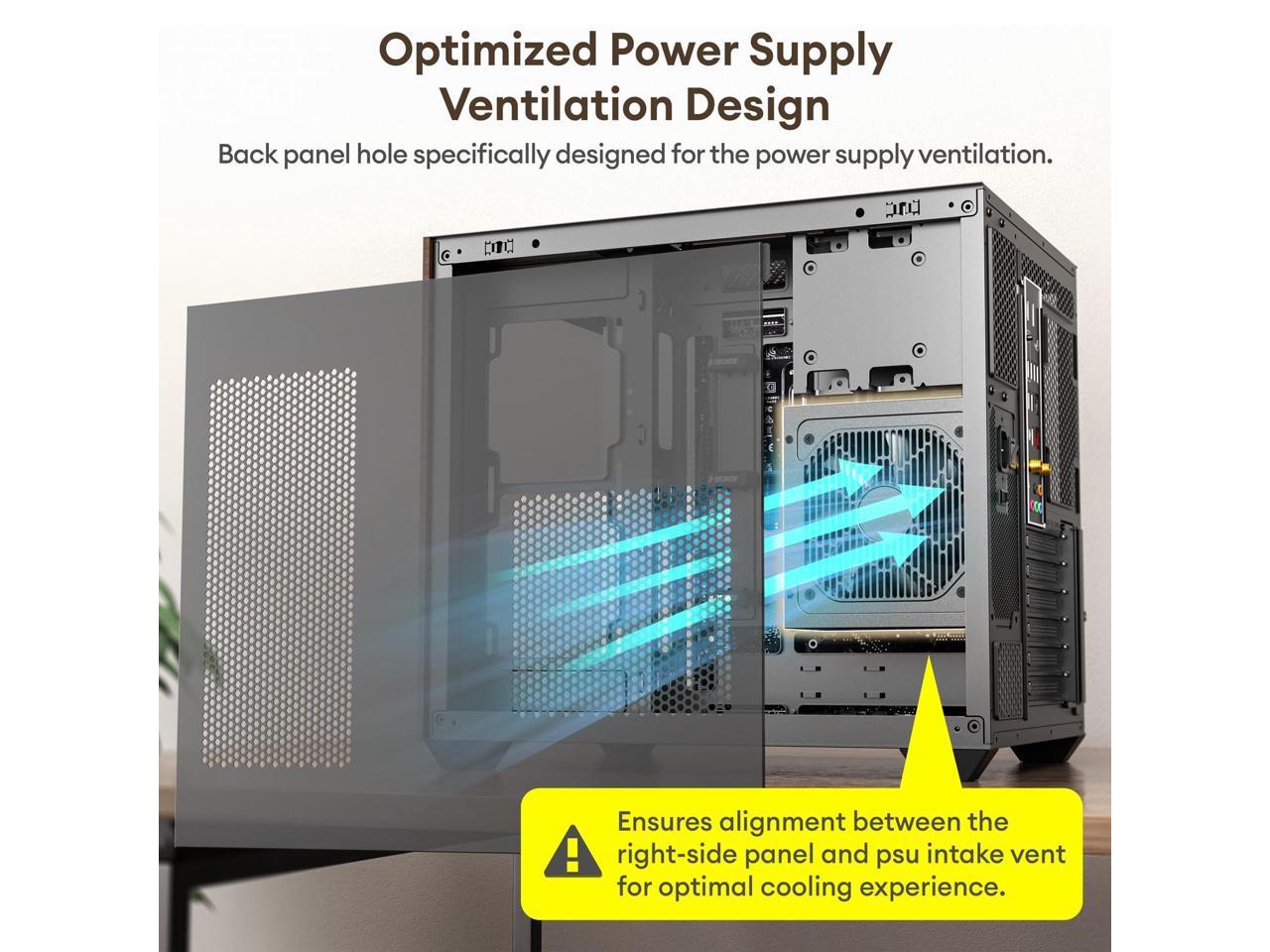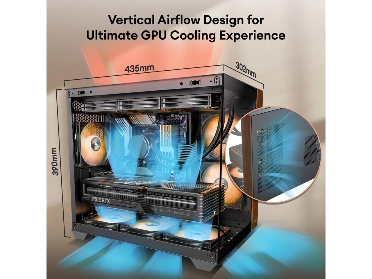 - Dual Air Intake Channels for Vertical Airflow Bottom and side intakes, with the top serving as the main exhaust, create a vertical airflow design. Added back intake vents enhance cooling performance and system efficiency.