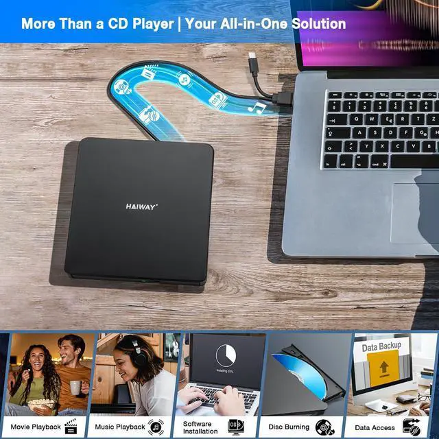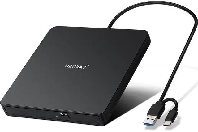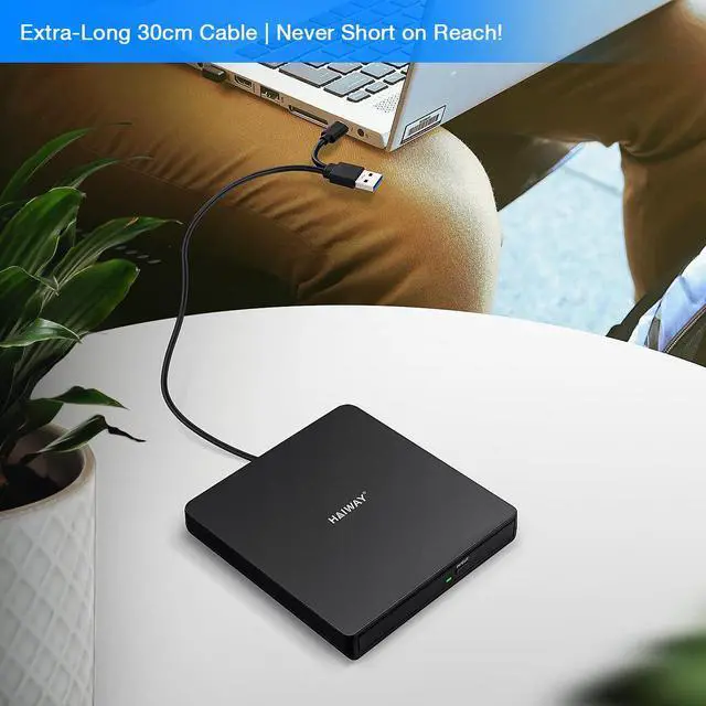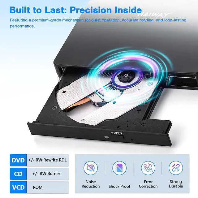 True Plug and Play Simplicity: Haiway External DVD Drive offers true plug-and-play functionality. Designed for simplicity, this usb cd/dvd external drive draws power directly from your computer's USB port, eliminating the need for an external power supply. No drivers to install. (For Mac users, the drive icon will appear once a readable disc is inserted.)