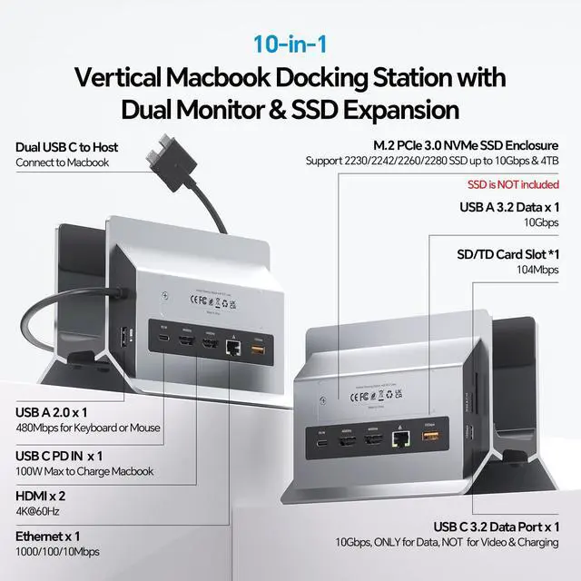 Docking Station Dual Monitor Designed for Mac Laptops - A laptop docking station with Dual USB-C 3.2 GEN2 & 10Gbps input, ONLY compatible with some MacBook Pro & MacBook Air models to enhance connectivity and functionality. Input: Dual Type-C 3.2 GEN2 & 10Gbps input, Max 100W PD IN ports, outputs: 2 HDMI 4K@60Hz, M.2 NVMe SSD expansion 10Gbps, USB C Gen2 10Gbps, USB A Gen2 10Gbps, RJ45 wired Gigabit Ethernet, USB A 2.0 and SD/Micro SD card readers. NOTE: 1) DO NOT support display via the USB-C port; 2) PD power adapter & power cable is NOT Included