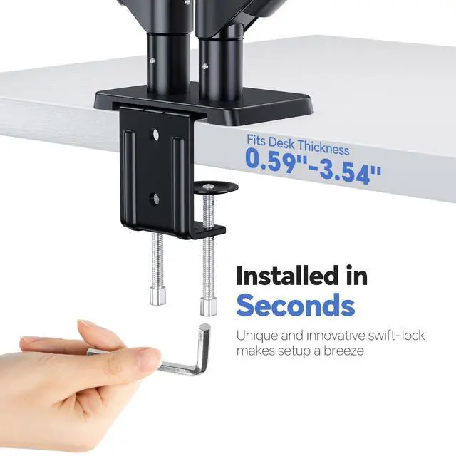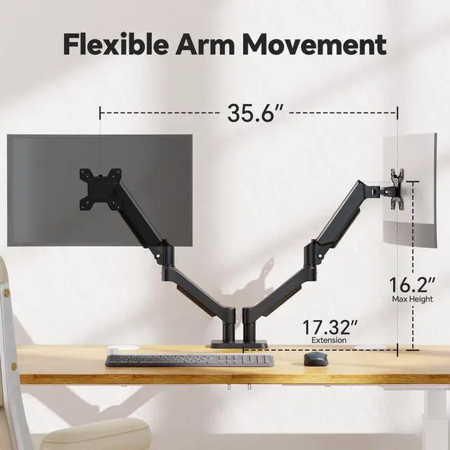 Rock-Solid Stability for Dual 32" Monitors: Engineered with reinforced zinc-alloy joints and steel construction, this arm provides unwavering support for two 24" monitors (19.8lbs each). The robust U-joint design eliminates screen wobble during typing or adjustments. Stress-tested for day-long stability during intense work sessions, it keeps monitors securely positioned while the durable build ensures long-term reliability. Perfect for demanding professional use.