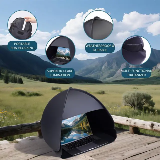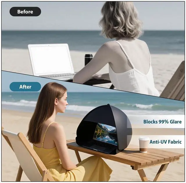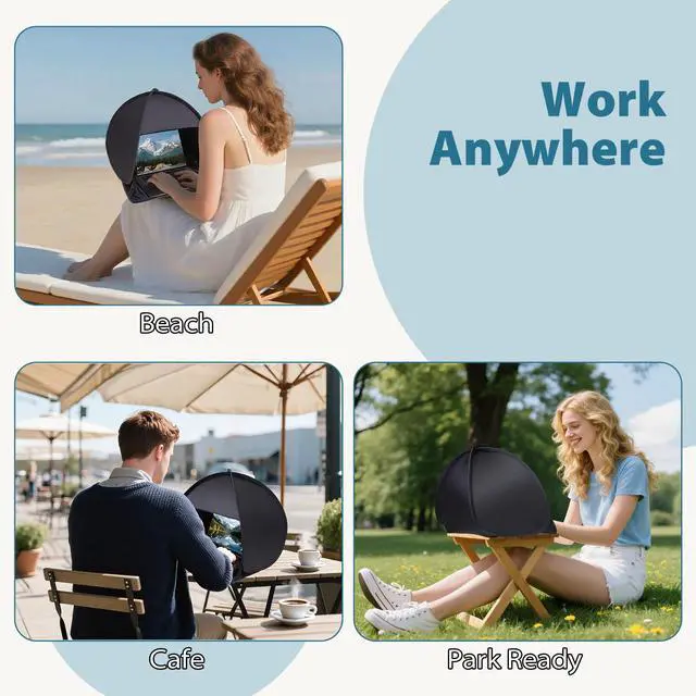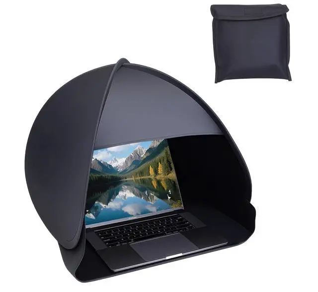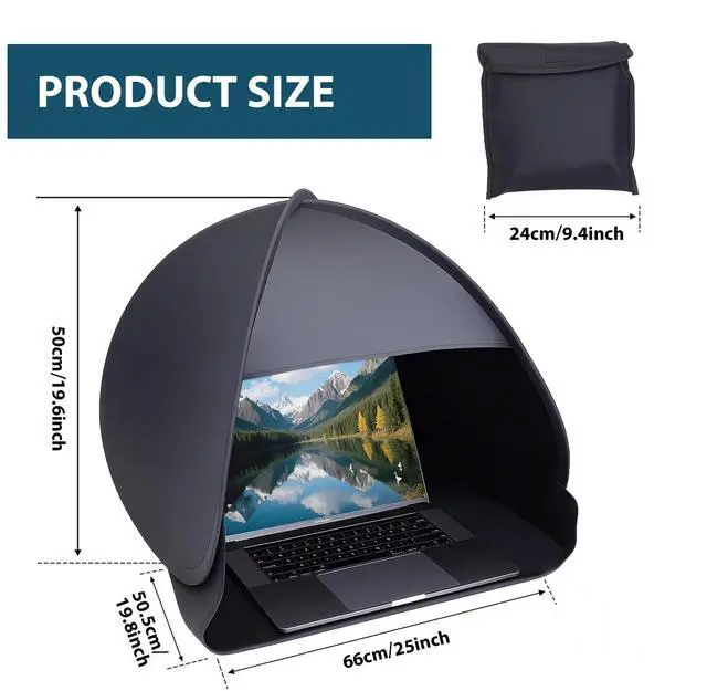 Portable sun-blocking design:Lightweight laptop sun shade folds into a compact pouch (8 diameter) for easy transport to beaches, parks, or outdoor workspaces.Fits up to 18 screens.