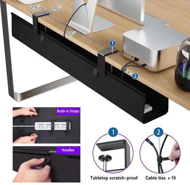 PREMIUM FABRIC MATERIAL: Our cable management tray is made of premium fabric material that is dust-resistant and fire-retardant, sturdy iron bar support with a load capacity of 25LBS, maximizes the safety of the internal wires and keeps dust out. Desk cord organizer long: 91cm/36 inches.