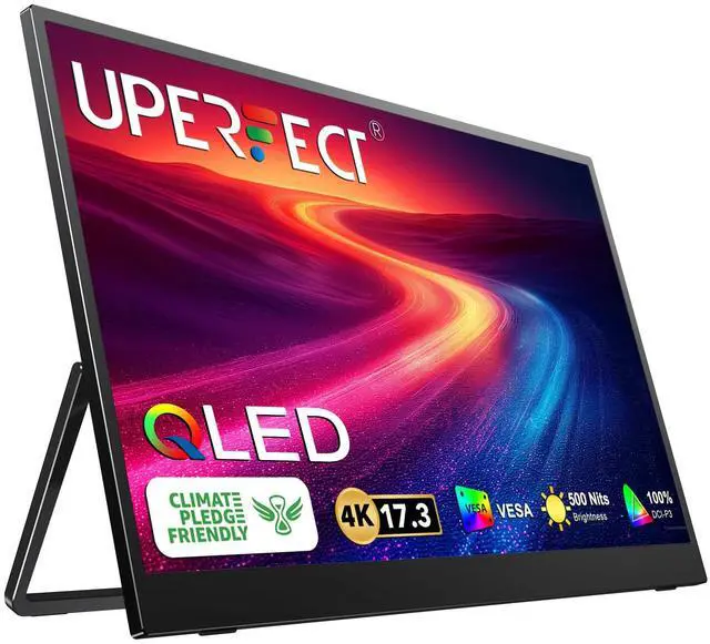 UPERFECT 17.3 '' 4K Portable Monitor QLED, 500 Nits 100% DCI-P3 UHD FreeSync HDR 2 Speakers Eye Care Travel Monitor, 2 Fully Functional Type-C Port & HDMI for Laptop PC Phone, VESA & Kickstand