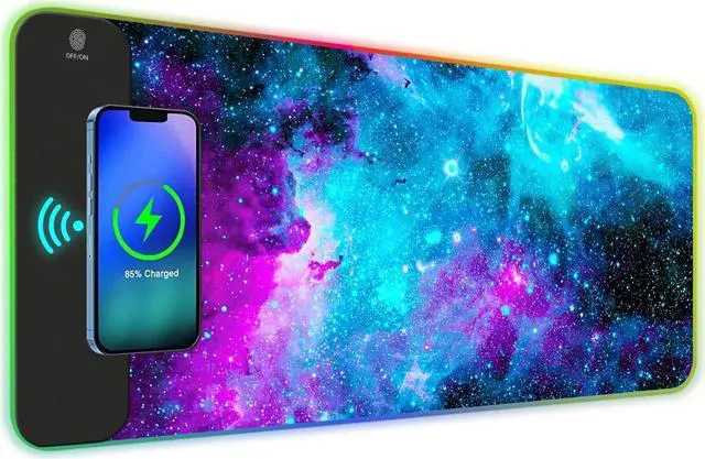 AIMSA Wireless Charging RGB Gaming Mouse Pad 15W, Extended LED Desk Mat Protector 800x300x4MM, 14 Light Modes Extra Large Mousepad Non-Slip Rubber Base Desk Mat, Galaxy Nebula Universe