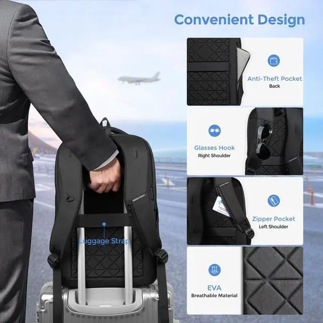 Fashionable & Comfortable This smart tech backpack features a modern design for both men and women. Durable, breathable, adjustable shoulder straps reduce pressure and relieve shoulder fatigue during extended use. The foam-padded top handle of the office backpack adds comfortable when carrying. EVA back panel of the compact backpack provides shock resistance and keeps the slim profile while offering large capacity for daily needs.