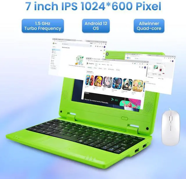 High Performance Equipped with a 1.5GHz Quad-core CPU, 2GB RAM, and 32GB storage, this netbook handles everyday tasks with ease. Run smoothly on the latest Android 12 OS and access millions of apps, from educational tools to interactive games, directly from the APP Store.