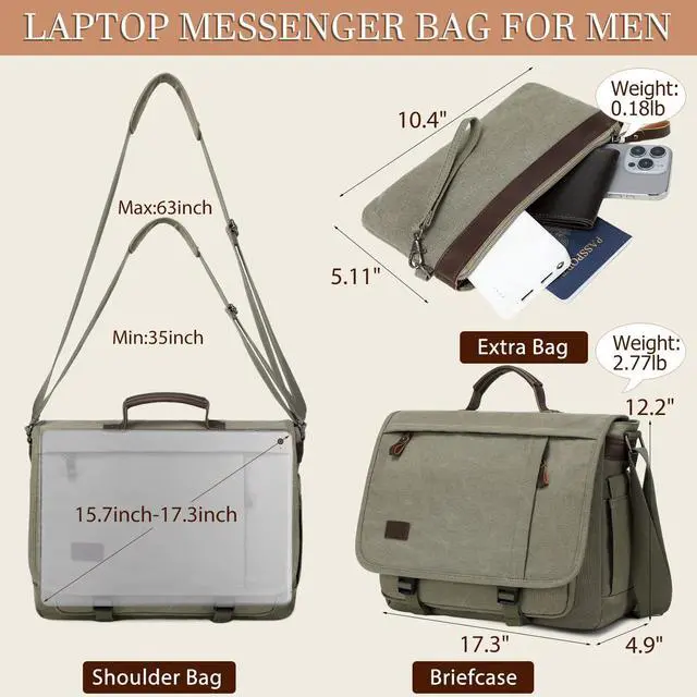 [ 17.3" LAPTOP BAG DIMENSIONS ] The external dimension of this briefcase is 17.3"L * 4.7"W * 10.2"H (2.77 pounds). Extra bag is 7.8"L *4.8"H (0.18 pounds). This messenger bag inner padded laptop sleeve fits up to 12.9 inch-17.3 inch laptop/tablet/computer. Not fit for larger computer. Note: Please measure your laptop before order!