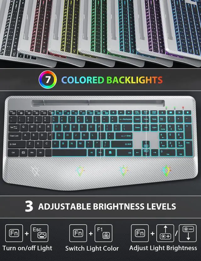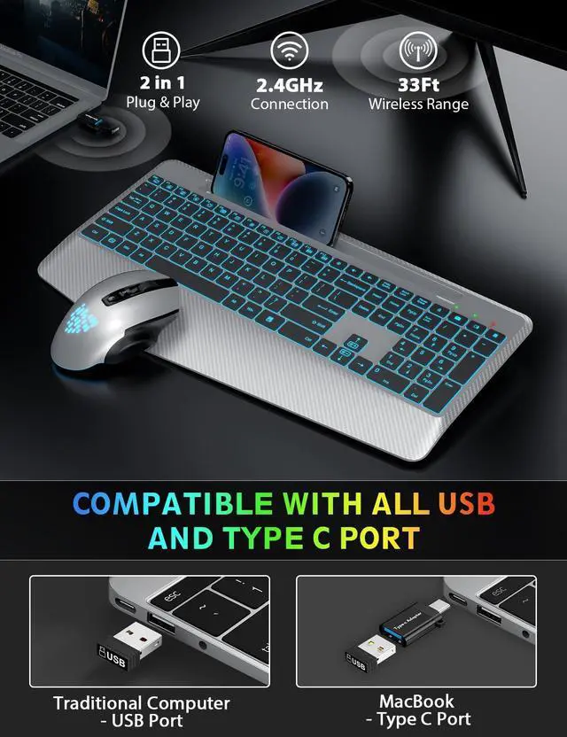 Wireless Keyboard and Mouse Backlits, Wrist Rest, LED Mouse, Rechargeable Ergonomic Keyboard with Phone Holder, Silent Light Up Combo for Computer, Mac, PC, Laptop, Chromebook (Silver Black)