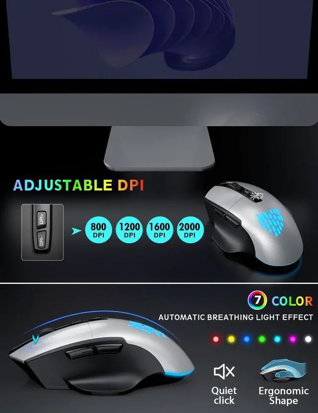 WIRELESS BACKLIT MOUSE: The cordless LED mouse features forward and backward shortcut keys, making it easier for you to control page navigation and file scrolling. It also offers adjustable DPI levels800, 1200, 1600, and 2000for precise cursor control across different tasks