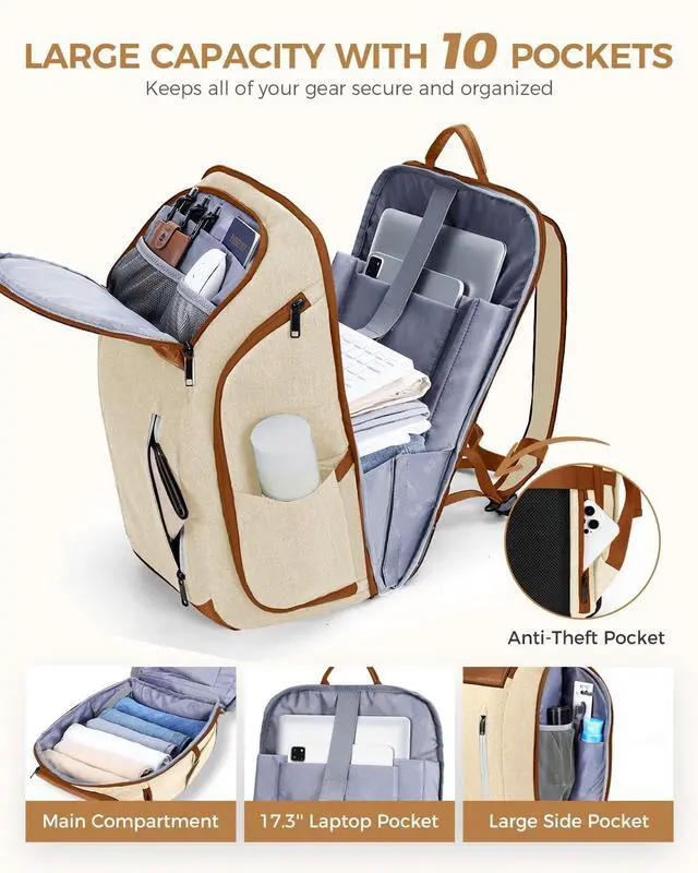 Ponhog 17 Inch Laptop Backpack for Women, Business Travel Anti-Theft Backpack with USB Charging Port, Water Resistant Computer Bag Carry On Flight Approved for Work College Weekender, Beige