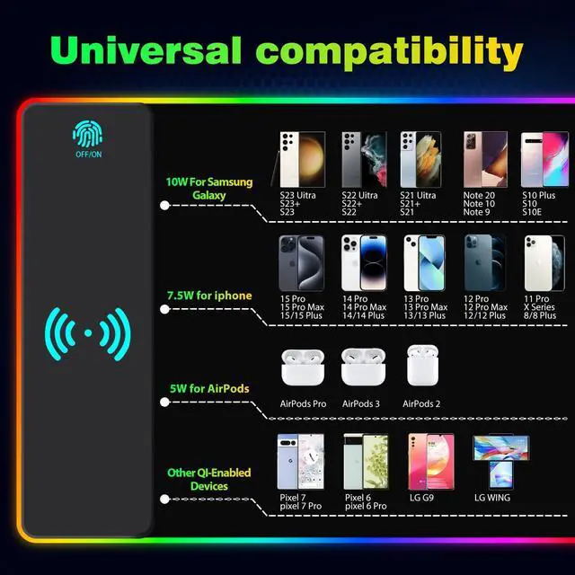 15W Qi Wireless Charging Mouse Pad:This RGB Mouse Pad Built-in 15W wireless fast charging compatible with smartphones which support wireless charging such as 8/X/XR/XS/11/11 Pro/12/12 Pro/12 pro max/13/13 Pro/13 pro max/14/14 Pro/14 pro max, Samsung Galaxy 10/S9/S8 Plus, Galaxy Note 9/8. (NOTE: 15W, 10W,7.5W requires a power adapter 9V 2a/ 5V 2a /5V 2.4a, but a power adapter is not included.)
