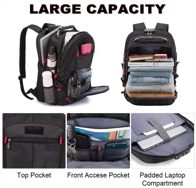 ANTI-THEFT DESIGN & TSA FRIENDLY With Fixed Password Lock and Durable Metal Zippers, our 17 inch laptop bag is safe guaranteed for protecting your valuable items inside. No need to worry theft easily opening your backpack when you are travelling or lining up.With the instruction card,you dont need to worry about forgetting your code. And lay-flat design is for easily organized and get your items via opening up to 180 degree when through the airport security.