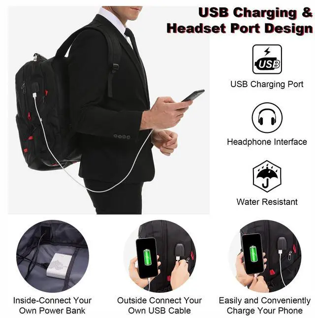 CONVENIENT USB&HEADSET PORT DESIGN Laptop backpack offers a convenient USB charging port outside. Great for charging your phone or other electronic devices while walking. (Please note that the power bank is not included in this USB laptop backpack). And the headphone interface frees your hands when enjoying audios, music, etc.