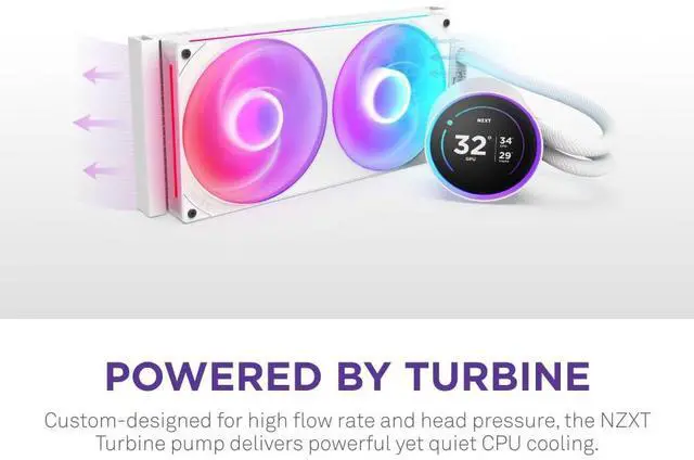 The Kraken Elite AIO RL-KR28E-W2 offers powerful, low-noise CPU cooling with the custom-designed NZXT Turbine pump, and extensive personalization options for the stunning 2.72 -inch IPS display.