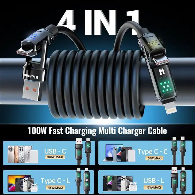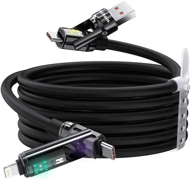 4-in-1 Universal Compatibility - One cable for all your devices! 4-in-1 charging cable solution features four connectors: USB-C to USB-C, USB-C to Lightning, USB-A to USB-C, and USB-A to Lightning. Effortlessly charge and sync the latest iPhone 17/16/15/14 series, iPad, MacBook, Samsung Galaxy, Nintendo Switch 2, and most USB-C/USB-A devices. Perfect for travel, work, or homeSimplify your life and ditch the cable clutter for good