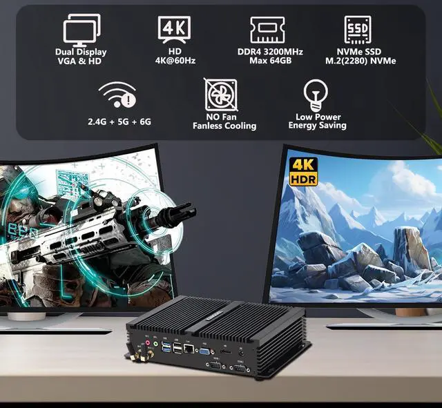 RAM & SSD of the Fanless Mini PC: Pre-installed 16GB DDR4 3200MHz RAM, 1TB NVMe SSD