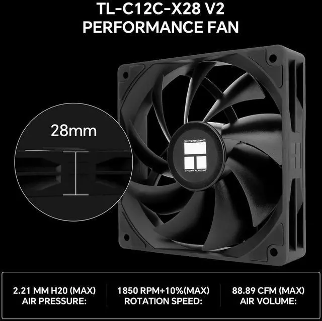 [Dual Thickness PWM Fan] TL-C12C-X28 V2 Fan; Fan Size:120x120x28mm (4.7x4.7x1.1 inches); Fan Speed(RPM):1850rpm±10%; Power Port: 4pin; Airflow:88.89CFM(MAX); Noise Level25.6dB(A)