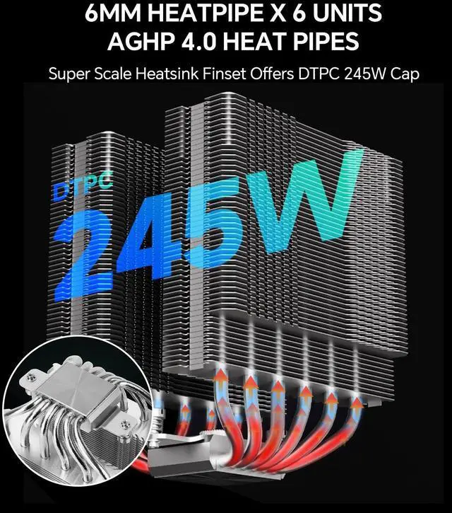 [AGHP GEN 5.0 Technology] 6×6mm heatpipes apply GEN 5.0 technology to solve the anti-gravity effect caused by vertical and horizontal direction, 6 pure copper heatpipes+PWM fan+ pure copper base & fully electroplated reflow soldering process, TDP up to 265w to maximize CPU cooling performance