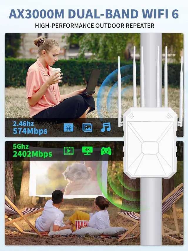 - This outdoor Wi-Fi signal extender supports dual-band 574Mbps (2.4GHz) + 2402Mbps (5GHz), delivering wireless speeds of up to 3Gbps. The latest WiFi 6 (802.11ax) technology provides faster throughput, lower latency, and more simultaneous connections perfect for farms, barns, RVs, campsites, and large backyard WiFi coverage.