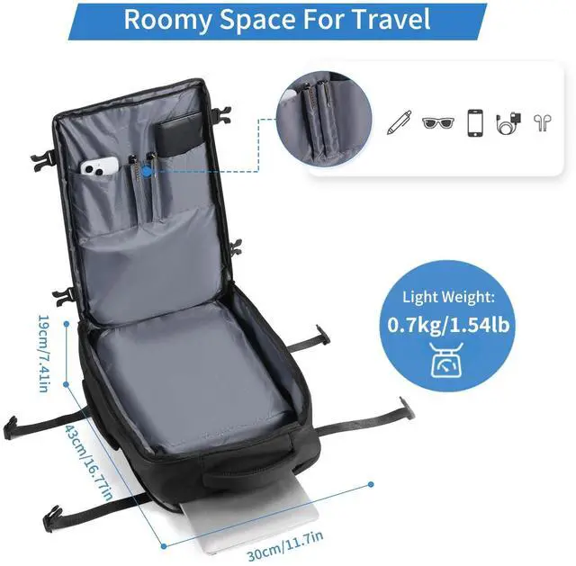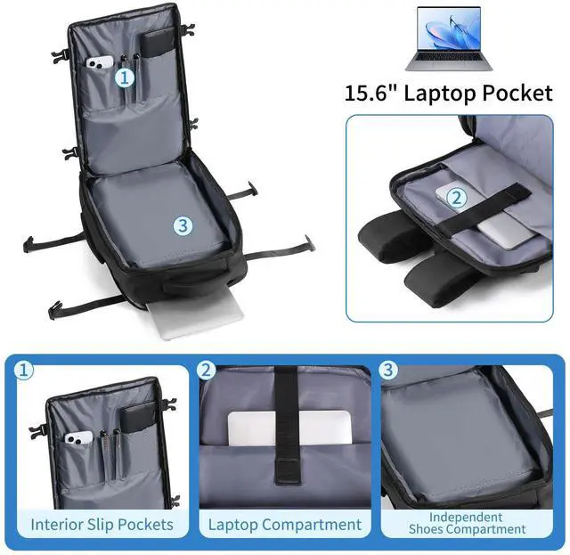 Shoes & Laptop Pockets: It includes a dedicated laptop sleeve that fits up to a 15.6-inch laptop. One shoe compartment on the bottom of backpack carry on to keep the shoes separate and everything else clean. Two venting hole in shoe section, make it keep breathable to not smelly