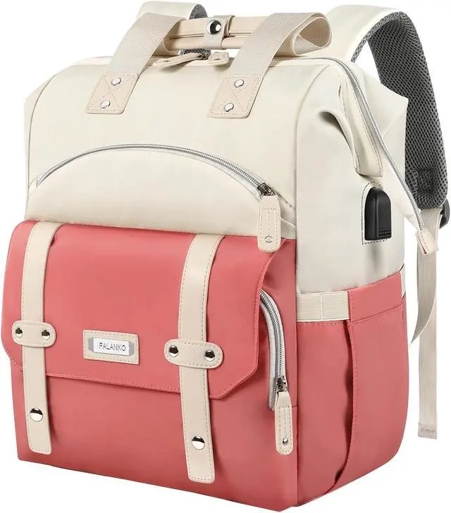 FALANKO Laptop Backpack for Women, Teacher Doctor Nurse Work Purse Bag for 15.6 Inch Laptop, Wide Open backpack With USB Charging Port RFID Pocket, Large, Water Resistant, White-Pink
