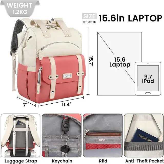 [Large Travel laptop backpack]: Size:11.4"x 7"x 15.7" (L*W*H), Capacity: 20L. This travel Backpack for Women designed with lots of pockets:2 front pocket can hold your keys,pens,wallet; 4 inner small pocket;2 side pockets for water bottles or umbrella; 1 Main Pockets can fit some clothes,notebooks,power bank;1 Laptop Compartment for 15.6inch Laptop and 1 iPad Compartment for 11inch ipad,1 Interior Zipper Pocket,1 anti-theft Back Pocket for cellphone.