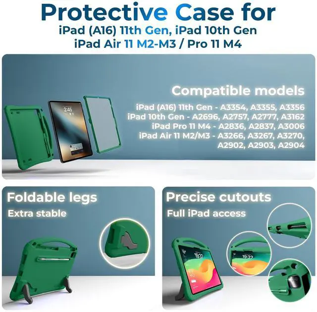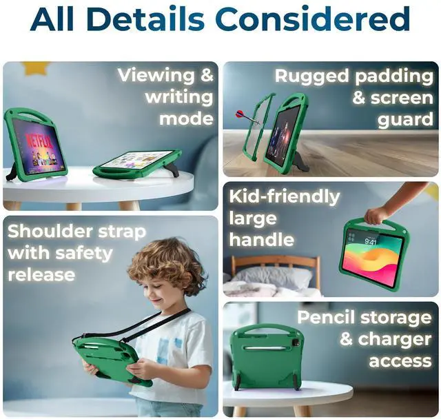 • All Details Considered: iPad Air 11 inch case kids with extra stable dual-angle stand for kids to read, study, watch videos, play games, draw, paint; child-friendly oversized handle; pencil storage; charger access