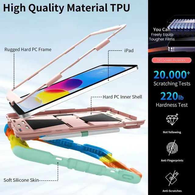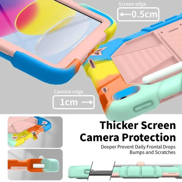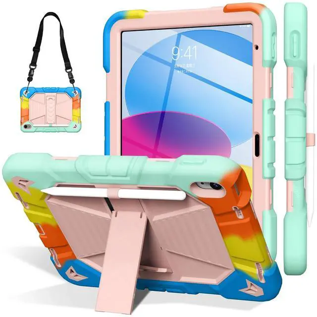 Inch (2022) (Models: A3356/A3355/A3354/A2777/A2757/A2696). Ensure your device model matches for a perfect fit. ^^ Military-Grade Triple-Layer Shockproof ProtectionEngineered with heavy-duty shockproof PC, flexible silicone, and reinforced corners, this rugged cover meets military-grade drop-test standards (MIL-STD-810G). The built-in screen protector and raised edges guard against scratches, drops, and impacts, ensuring ultimate durability for outdoor adventures or kids active lifestyles. ^^ All-in-One Functional DesignFeatures a built-in kickstand for horizontal/vertical viewing, a dedicated pencil slot for Apple Pencil storage, and a detachable shoulder strap for easy portability during travel or outdoor use. ^^ Precise Cutouts & Full AccessibilityStrategically designed openings provide effortless access to all ports, buttons, and cameras without removing the case. Ideal for daily use, gaming, or creative work. ^^ Gift-Ready Packaging & Reliable Customer SupportThis stylishly packaged protective cover makes a practical gift for birthdays or holidays. If you have any questions about this ipad 10th generation case for kids, please feel free to email us, we will provide you with the fastest and best solution!