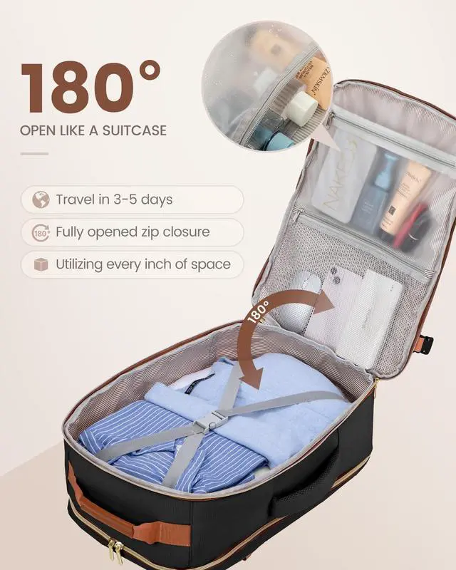 As Personal Item Airline Approved: The size of the carry on backpack is 18*14*8inch. Meets the maximum size allowed by most International Air Transport Association (IATA) flights, and can be placed in the overhead luggage compartment and under seat luggage for airlines, suitable for Spirit, Frontier, Easy Jet, Jet Blue, and other airlines. This travel backpack for women airline approved can be freely opened 90-180 degrees easily and quickly at the airport security check. ^^ With 3