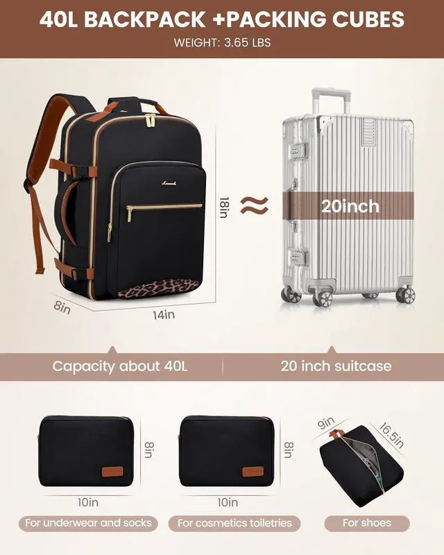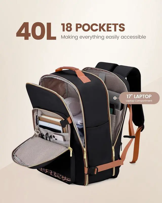 Large Capacity & Multiple Pockets: The travel backpack has a 40L large capacity and 4 main compartments, which can meet daily and travel needs. The travel backpack for women's main compartment can store a lot of things, including 5-8 pieces of clothing, shoes, books, and many other items. The separate laptop compartment is padded with EVA foam to provide the best protection for your 17" laptop and 12.9" iPad. The front compartment has many pockets to keep your belongings organized. ^^