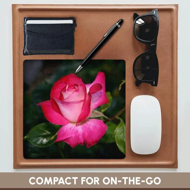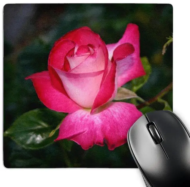 Pink Rose Mouse Pad is 8" x 8" x. 25" and is made of heavy-duty recycled rubber. Matte finish image will not fade or peel. Machine washable using a mild detergent and air dry.