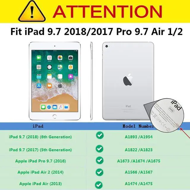• Fit New iPad 9.7 inch: Apple iPad 9.7 (2018) 6th generation, Apple iPad 9.7 (2017) 5th generation, also for iPad Pro 9.7 (2016), iPad Air/Air 2 9.7"