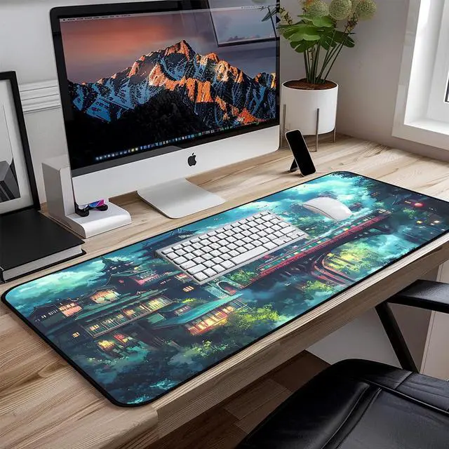 Japanese Anime Desk Mat, Green Forest Mouse Mat XXL, Game Desk Pad, Fantasy Architecture Computer Keyboard Mat, Wireless Mousepad Large,Natural Landscape Home Office Desktop Decor 31.5"X15.7"