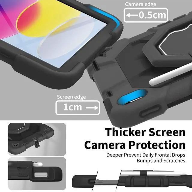 Inch (2022) (Models: A3356/A3355/A3354/A2777/A2757/A2696). Ensure your device model matches for a perfect fit. ^^ Military-Grade Triple-Layer Shockproof ProtectionEngineered with heavy-duty shockproof PC, flexible silicone, and reinforced corners, this rugged cover meets military-grade drop-test standards (MIL-STD-810G). The built-in screen protector and raised edges guard against scratches, drops, and impacts, ensuring ultimate durability for outdoor adventures or kids active lifestyles. ^^ 360 Rotating Stand & Multi-Angle ViewingThe built-in kickstand rotates 360 and folds adjustably, providing stable horizontal or vertical viewing angles between 30-80 degrees. Ideal for typing, watching videos, or drawing in classrooms, offices, or during travel. ^^ Pencil Holder & Detachable Shoulder StrapA dedicated slot securely stores your Apple Pencil, while the adjustable shoulder strap allows hands-free carrying. Great for commuters, students, or artists who need convenience and portability. ^^ Precise Cutouts & Full AccessibilityStrategically designed openings provide effortless access to all ports, buttons, and cameras without removing the case. Ideal for daily use, gaming, or creative work. ^^ Gift-Ready Packaging & Reliable Customer SupportThis stylishly packaged protective cover makes a practical gift for birthdays or holidays.