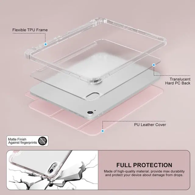 360 Ultimate Protection: Premium and durable PU leather front cover, PC hard translucent back shell, lined with soft microfiber, TPU frame and airbag to prevent scratches and impacts, bring 360 all-round protection to your iPad