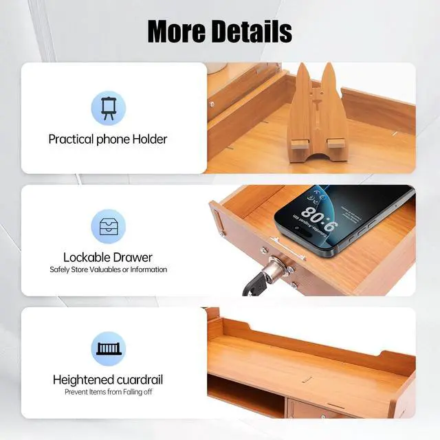 Multiple Storage Options: 3 drawers (1 lockable), large compartment, phone holder, and guardrails for safety.