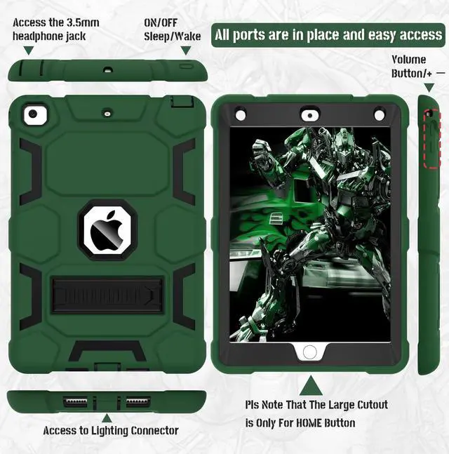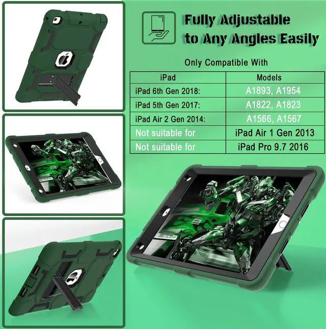 Compatible ModelsProof Case for iPad 6th/5th Generation 9.7 inch (A1893/ A1954/ A1822/ A1823) 2018/2017 Release, iPad Air 2 2014 Release (A1566/ A1567), [No Screen Protector] DO NOT fit other iPad. ^^ Exclusive Design The appearance design makes you associate with the hero of animation. Fans can imagine heroic battling villains in a fight for the fate of the world with this ipad 6th generation case figure. Muscle mass design makes it more protective and easy to hold. ^^ Convenient KickstandiPad 5th generation case built-in sturdy kickstand, extremely convenient and easy to push out and back in.