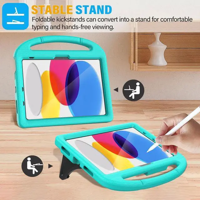 Generation 10.9 inch 2022(Model: A2696 A2757 A2777), NOT fit for iPad Air 4/5( 10.9" ). Please CONFIRM your iPad model before. ^^ Full-body ProtectionMade of durable, child-safe, lightweight, wear-resistant, shock-absorbing EVA material, protects your iPad from accidental drops and bumps. ^^ Built-in Screen Protector & Pencil HolderBuilt-in a clear screen protector prevents scratches and dirts, pencil holder allows you easy store and remove your apple pencil (Pencil NOT Included). ^^ Built-in Stand & HandleBuilt in a foldable kickstand, it can convert into a stand for comfortable typing and hands-free viewing, Non-slip handle is designed to be easy for kids to carry. ^^ Easy to UsePrecise cut-outs for buttons, ports and cameras, allows you easy access to all features without removing the case, you can also easy to install or remove this case.