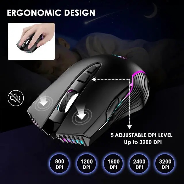 ^^ Rechargeable Mouse with 800mAh Battery - This wireless LED mouse has a built-in durable rechargeable battery, which can provide an ultra-long battery life of 10 days (LED on) to 16 days (LED off) on a single charge. Recharged easily with the included USB-C cable. (It takes 2.5 h to fully charge the mouse) ^^ Comfortable & Long-lasting - The computer mouse is ergonomically designed and made of skin-friendly material, so you won't feel tired or painful after a long time using. Adopts micro switch design, which is not easy to age, has a service life of up to 80 million clicks! And silent click reduces 90% noises, which makes it an office/home gaming mouse.