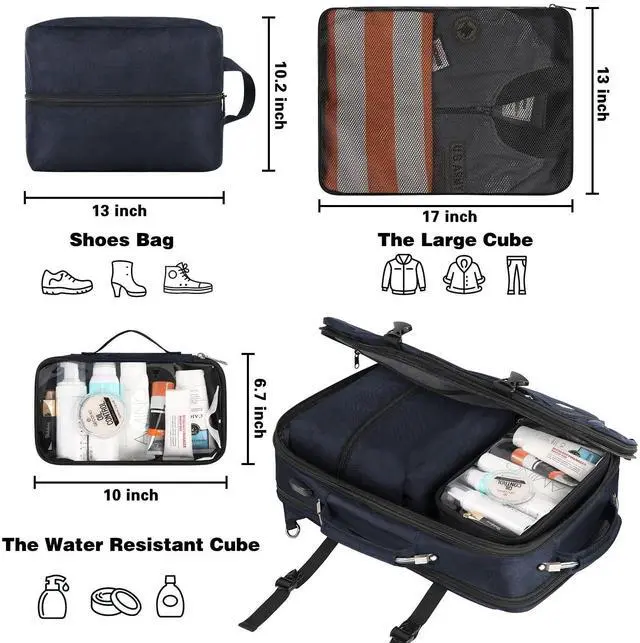 Carry: The carry on backpack is designed with hideaway padded shoulder straps which can be easily stored away in zippered back panel, transforming this vacation backpack from carry-on duffel to briefcase style and provide you a more flexible carrying experience. A luggage strap on the back is designed to fit on luggage/suitcase, for easier carry on international travel or cruise. 4 external compression straps keep contents from sloshing around. ^^ 3 Storage Bags & Easy to