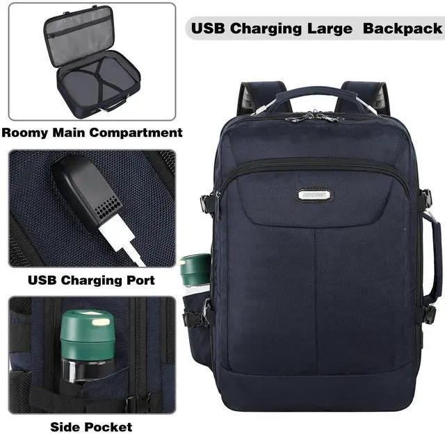 Expandable & Large Capacity: This extra large travel backpack with expandable feature offers you more packing capacity. Unzipping to get 45L storage then you can easily hold 3-7days travel gear. It fits overhead and under seat while on state of standard carry on size, is ideal for men, women, weekend traveler, or occasional vacationer. This versatile luggage backpack also meets airline carry-on requirements, for airlines such as Easy Jet, Spirit, Jet Blue. ^^ USB Charging Port & Side Pocket: Made of Water Resistant Polyester Fabric and anti-scratch material, ensure a secure & long-lasting usage. Many hidden pockets can accommodate lots of travel accessories, toiletries, side Zipper pocket for Easy access essentials, external USB port with set-in charging cable offer convenient charging your cellphone and other electronic devices. It's the best gift for Mother's Day, Father's Day, and also the best travel gift for girlfriend, wife, daughter, friends. ^^ Convertible Design & Easy to