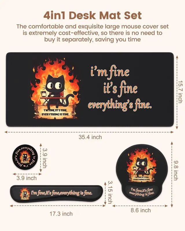 Package Includes: desktop mat ( 35.4" 15.7" ), ergonomic wrist rest ( 17.8" x 3.3" ), mouse pad cute (9" x 10"), Coaster ( 3.5" ). Our 4-in-1 Set will complete the look and feel of your desk ^^