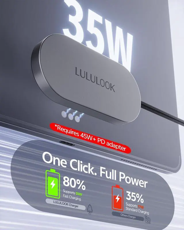 Wire Trap: Engineered with intelligent magnetic retention that stays securely connected during normal use yet detaches smoothly when tripped over, this charger combines the best of both worldsreliable daily charging and crucial drop protection. Like MacBook's safety mechanism, it prevents costly accidents while reducing physical stress on your iPad's port ^^ Fast Wireless Charging Experience rapid power delivery with up to 35W fast charging, designed to juice up your iPad Pro 13 from 0% to 60% in just one hour while maintaining a cool temperature below 99Fensuring efficient, safe charging without overheating risks. For optimal performance, pair with a 45W or higher PD adapter to unlock full speed and keep your creative flow uninterrupted. ^^ Ultra-Thin Comfort Grip Crafted from premium aluminum alloy to seamlessly match your iPads aesthetics, this ultra-thin charger measures just 0.2 inches thickensuring it lies completely flat without protruding like a bulky USB-C port. Whether youre immersed in an intense gaming session or relaxing with a movie, the low-profile build eliminates any pressure on your palms, delivering a natural, comfortable grip that feels like an extension of your device