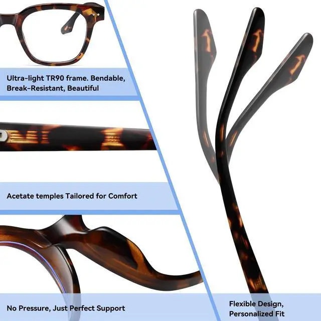PREMIUM MATERIALS: The Blue light frames are made of TR90 material, a lightweight and flexible option known for its strength and resilience and can be worn for long periods of time without adding pressure to the face. The acetate temples provide a luxurious feel while ensuring a secure fit, combining elegance with long-term durability ^^