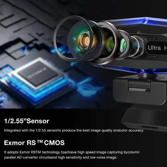 4K Ultra HD Webcam for PCThis 4K webcam for PC delivers sharp, clear video with 4K 30FPS resolution and an upgraded 1/ 2.55" CMOS sensor. 8MP camera with natural eye contact, perfect for professional video calls, streaming, and content creation ^^ Remote Control & 10X ZoomEasily control zoom (up to 10X), focus (auto/fixed), mute, and lighting using the remote. Supports up to 25601440 resolution when zoomed. A versatile USB webcam for meetings, presentations, and live shows ^^ Noise-Canceling MicrophonesDual digital mics reduce background noise for crystal-clear audio.