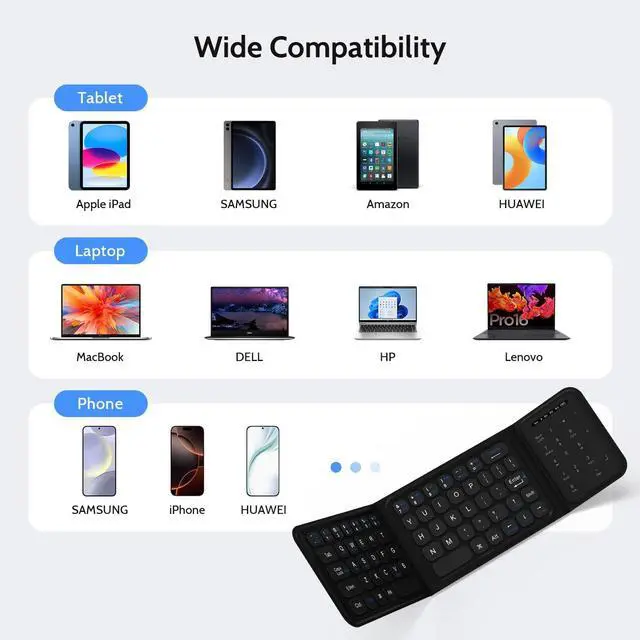 Only 6.9 -ounce, palm-sized keyboard can be folded up and carried around. ^^ Stable Connection & Wide CompatibilityBluetooth keyboard supports seamless connectivity to all Bluetooth devices (iOS, Android, Windows and Mac OS). Maintain a stable connection and provide fast response to devices within 10 m. Auto enter sleep mode after 10 min of inactivity to save power. Simply press any key to wake it up and auto connect to the last connected device.