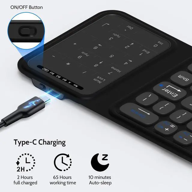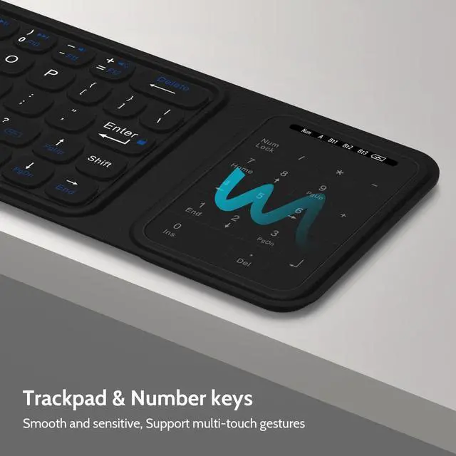 Folding Bluetooth Wireless Keyboard This portable bluetooth keyboard with trackpad and number keypad (Dimensions: 15.3 x 4.1 inch ). Standard size design provides accurate, fast typing, just like the desktop keyboard you are used to. Quiet keys also allow you to focus on your work. ^^ Foldable Keyboard with Trackpad Upgrade sensitive trackpad supports mouse left and right key function, so you can control the device without using mouse. Updated richer and more practical multimedia shortcut functions make your work more convenient and more efficient! Built-in rechargeable battery can last for 40 hours or 560 hours after 2-3 hours of charging. One full charge last enough for your short business trip or vacation! ^^ Support to 3 DevicesOur Folding keyboard allows you to pair up to 3 devices on triple bluetooth channels simultaneously. Easy switch at a press of button. Compatible with Windows, Mac OS, iOS or Android device, you can work with your ipad, phone, tablet or laptop seamlessly. ^^ Exquisite & Lightweight Portable KeyboardBlack exterior, made of ABS+Artificial leather material, lightweight but stable, without fear of daily wear and scratches. The elegant matte design, excellent touch and clean look make it a perfect match for your tablet, phone and laptop.